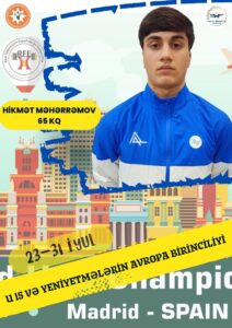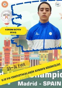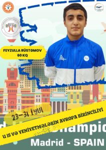 İspaniyanın paytaxtı Madrid şəhərində keçirilən U 15 və yeniyetmələrin Avropa birinciliyi davam edir. Bugün yarışda daha 3 təmsilçimiz mübarizəyə qoşulub. 60 kq çəki dərəcəsində çıxış edən Feyzulla Rüstəmov U 15 yaş kateqoriyasında körpücük üzərinə çıxıb. İki hərəkətin cəmində 186 kq (82+104) nəticə göstərən Feyzulla qitə miqyaslı yarışı 5-ci pillədə başa vurub.