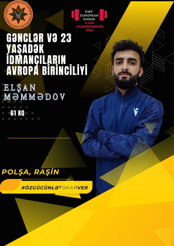 Elşan Məmmədov mübarizəyə qoşulub October 27, 2024 Atletimiz Elşan Məmmədov Polşada keçirilən gənclərin Avropa birinciliyində mübarizəyə qoşulub. İdmançımız birdənqaldırma yarışında 110 kq. çəki sifariş etsə də, 3 cəhddə bu ağırlığın öhdəsindən gələ bilməyib. Nəticədə Elşan yarışı erkən başa vurub.