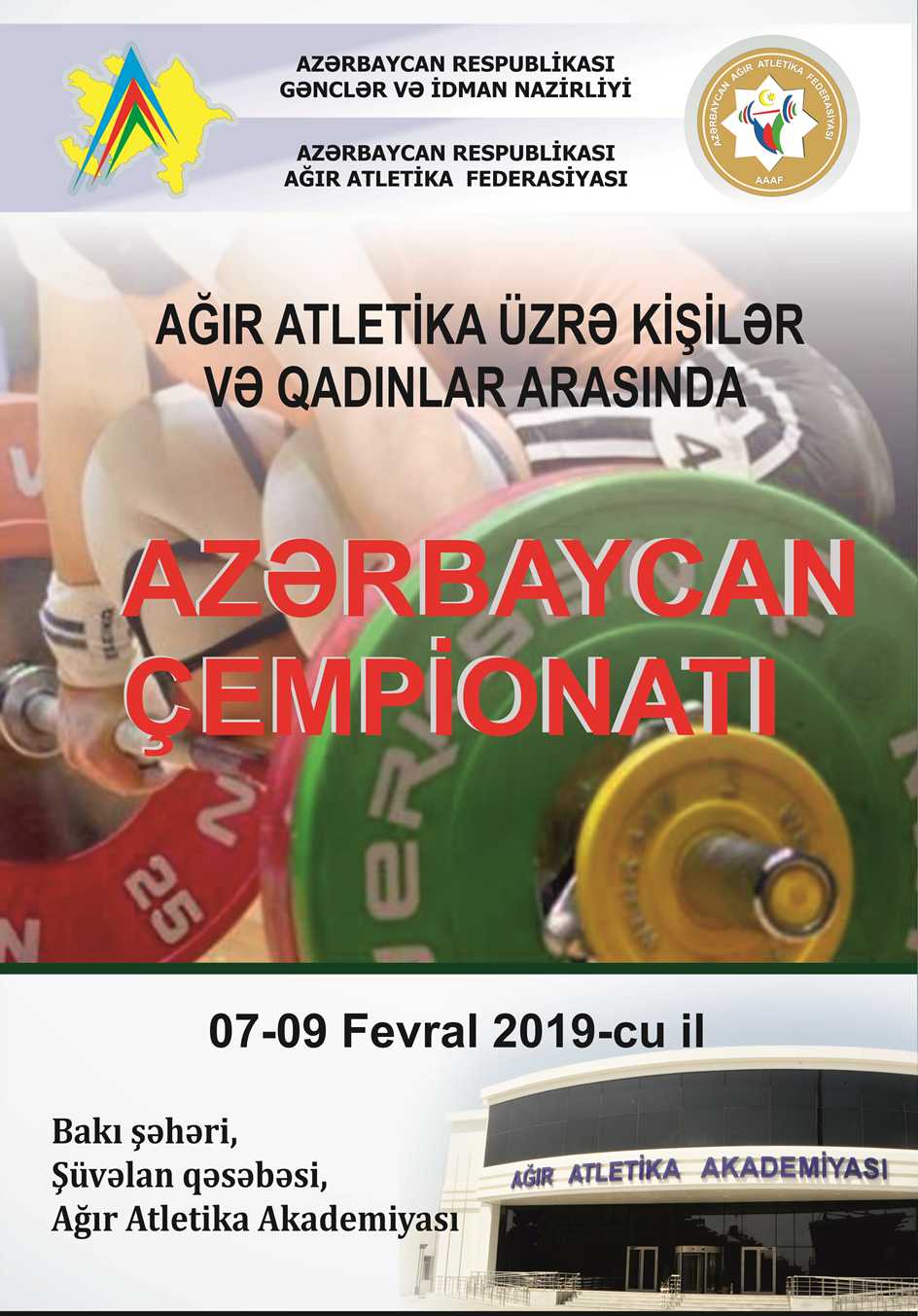 On February 7-8, Azerbaijan Weightlifting Championship among males and females will be held in the competition hall of Shuvelan Weightlifting Academy. In the competition, arranged with the cooperative organization of Ministry of Youth and Sports of Azerbaijan and Azerbaijan Weightlifting Federation, will be attended by approximately 100 athletes representing sport clubs and communities from all regions of the country.