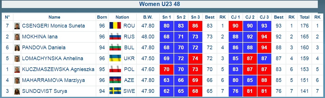 Today, one more athlete – Marziyya Maharramova joined the medal struggle, in 48 kg weight category, among U-23. She lifted 66 kg in snatch and was 6th. In clean and jerk, she was the 5th with 85 kg. Maharramova took the 6th place in the European Championship with a total of 151 kg (66+85) result.