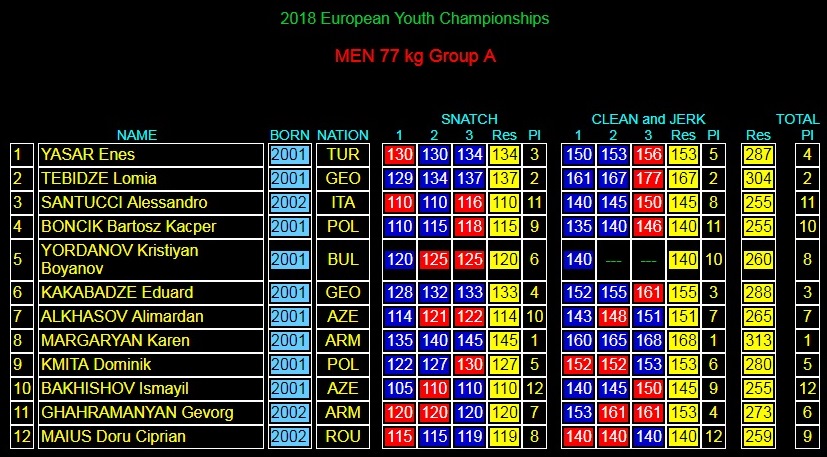 Ismayil Bakhishov took the 12th place with 110kg result in snatch, 9th place with 145kg result in clean and jerk, and in the final rankings he was 12th with a total of 255kg (110+145) result.