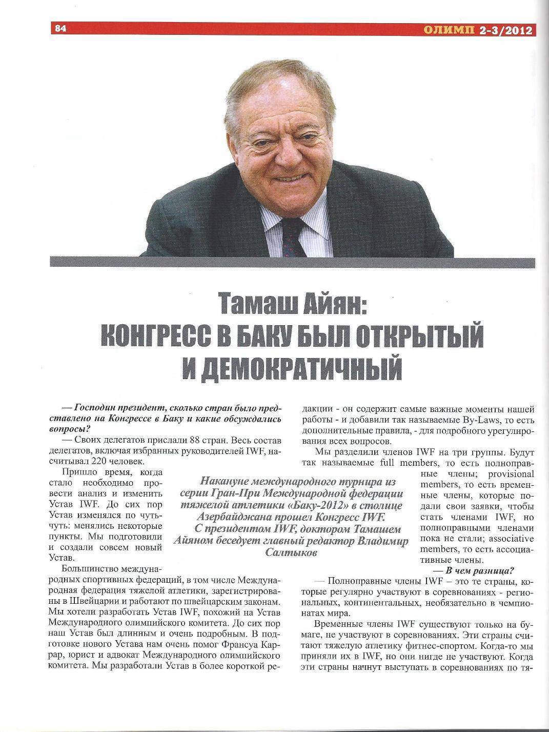 Məqaləyə yekun vuran Vladimir Saltıkov yazır ki, “sözsüz ki, Bakı Beynəlxalq Kuboku baş tutdu. AAAF-ın icraçı direktoru İsgəndər Əsgərovun sözləri ilə desək, bu Azərbaycan Respublikasının prezidenti və Milli Olimpiya Komitəsinin prezidenti İlham Əliyevin, eləcə də Ağır Atletika Federasiyasının prezidenti Cahangir Əsgərovun ağır atletikanın inkişafına göstərdiyi qayğısı sayəsində mümkün olub”.