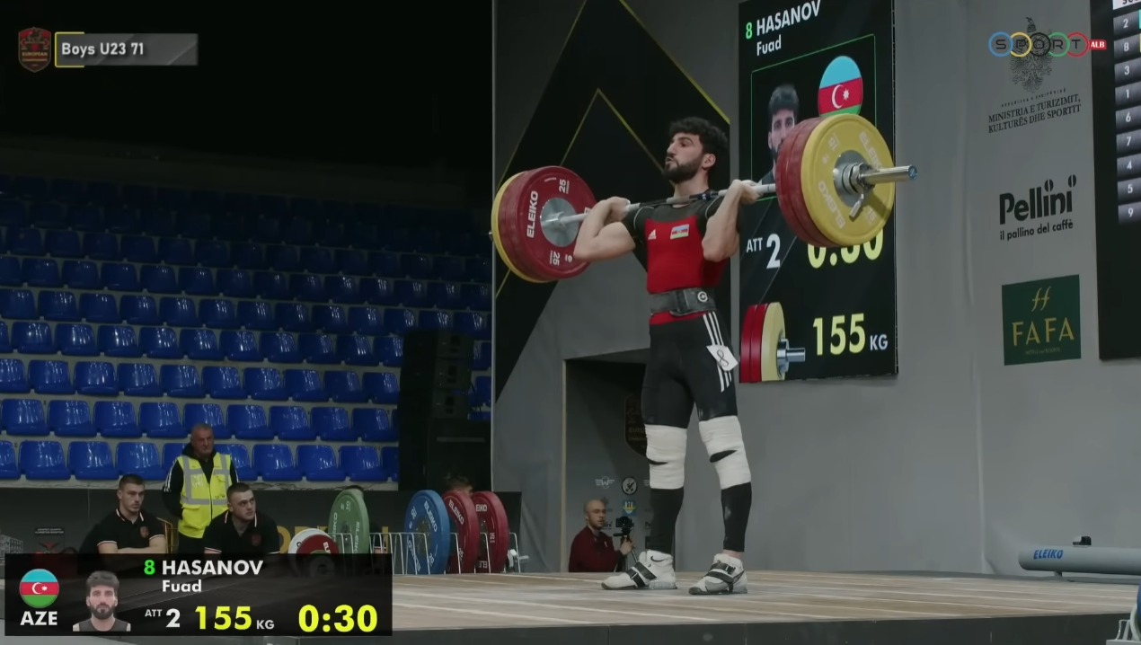 Ağırlıqqaldırma üzrə yığma komandamızın üzvü Fuad Həsənov Albaniyanın Dürres şəhərində keçirilən Avropa birinciliyində mübarizə aparıb. 71 kq çəki dərəcəsində yarışan Fuad birdən qaldırma hərəkətində 128 kq çəkini ram etməyi bacarıb. Təkanla qaldırma hərəkətində 155 kq ağırlığı başı üzərinə qaldıran atletimiz toplamda 283 kq nəticə ilə yarışı 6-cı yerdə başa vurub.