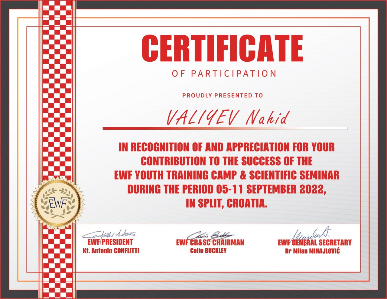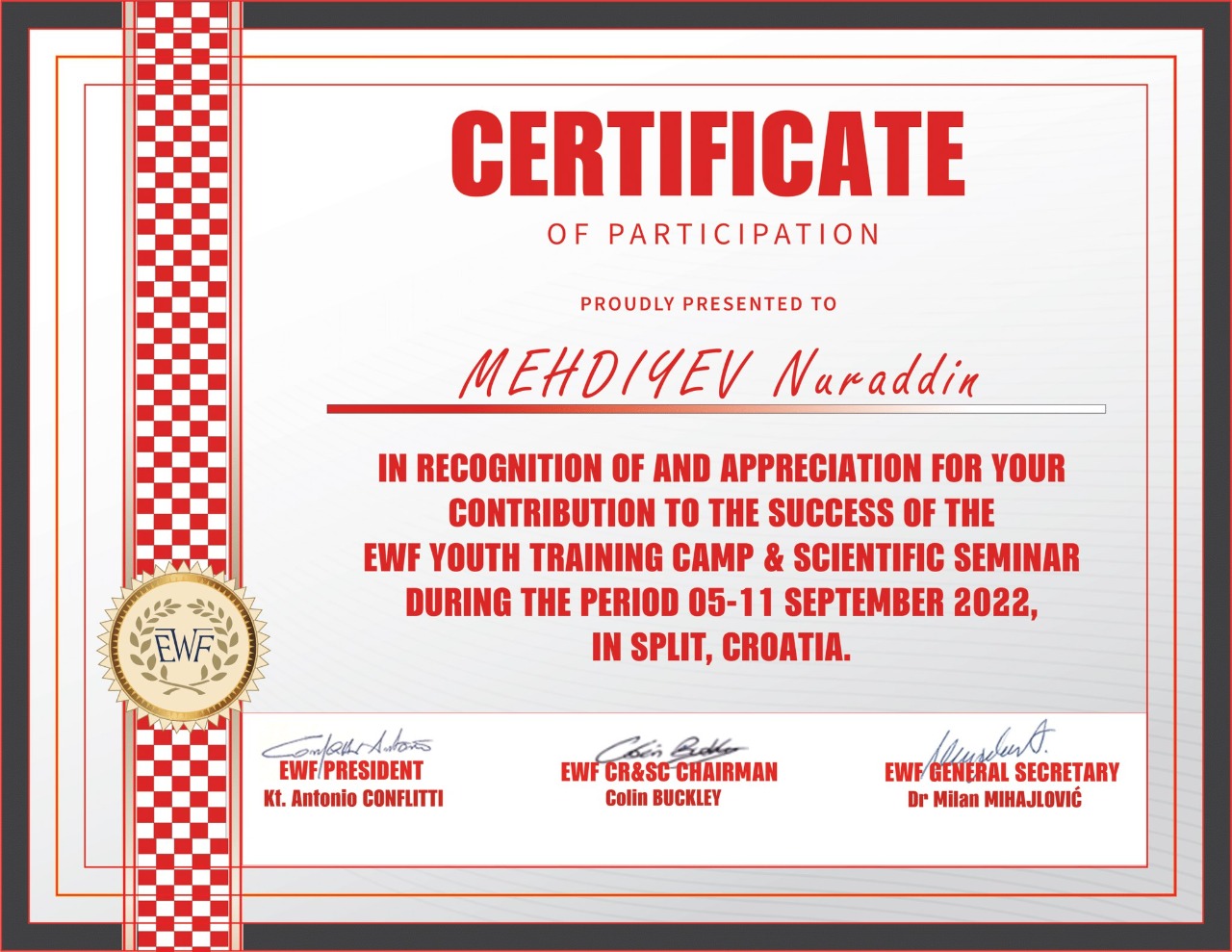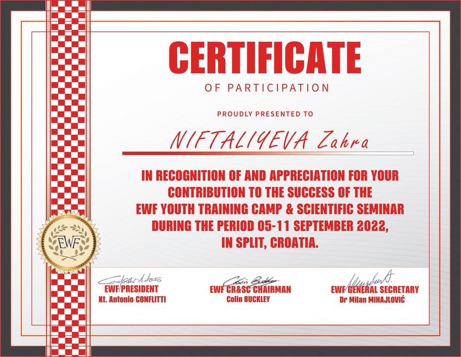5-11 sentyabr tarixlərində Xorvatiyanın Split şəhərində Avropa Ağır Atletika Federasiyasının təşkil etdiyi beynəlxalq təlim-məşq toplanışı və elmi seminarı keçirilib. Azərbaycan da daxil olmaqla 9 ölkə – Belçika, Sloveniya, Bosniya və Herseqovina, Polşa, Türkiyə, İtaliya, Rumıniya və Xorvatiyadan olan 40 idmançı və 15 məşqçi bir araya gəlib. Azərbaycanı bu toplanışda məşqçilər Nahid Vəliyev və Elnarə Abbasova, idmançılar Nurəddin Mehdiyev və Zəhra Niftəliyeva təmsil ediblər.