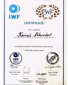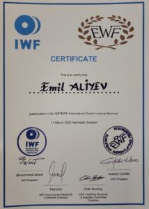 11-13 mart tarixlərində İsveçin Halmstad şəhərində Beynəlxalq Ağır Atletika Federasiyasının (IWF) məşqçilərin lisenziyalaşması pilot proqramının ilkin təqdimatı keçirilib. Avropa Ağır Atletika Federasiyasının (EWF) təşkilatçılığı ilə baş tutan tədbirdə ağır atletika üzrə 100-ə yaxın mütəxəssis iştirak edib ki, onların arasında Azərbaycan yığmasının baş məşqçisi Emil Əliyev və federasiyanın baş katibinin köməkçisi Kamal Axundov da olub.