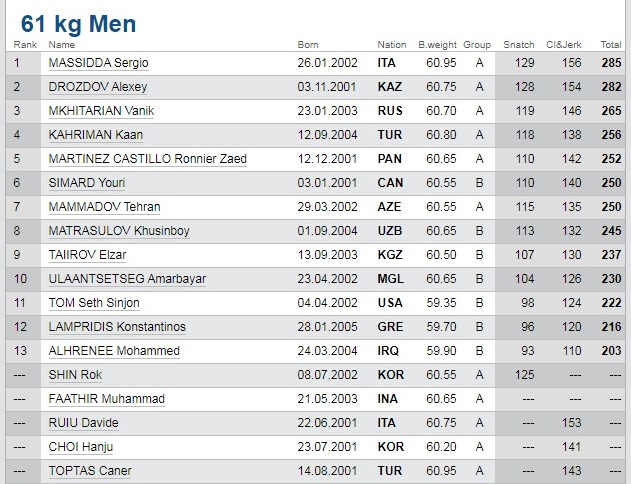 Baş məşqçilər Oktay Muxtarov (yeniyetmələr) və Maksum Xasanovun (gənclər) rəhbərliyi altında komandamızın heyətindən ilk olaraq Tehran Məmmədov körpücük üzərinə çıxıb. O, 61 kq çəki dərəcəsində yarışıb. Atletimiz toplam 250 (115+135) kq nəticə ilə dünya birinciliyində 7-ci yeri tutub.